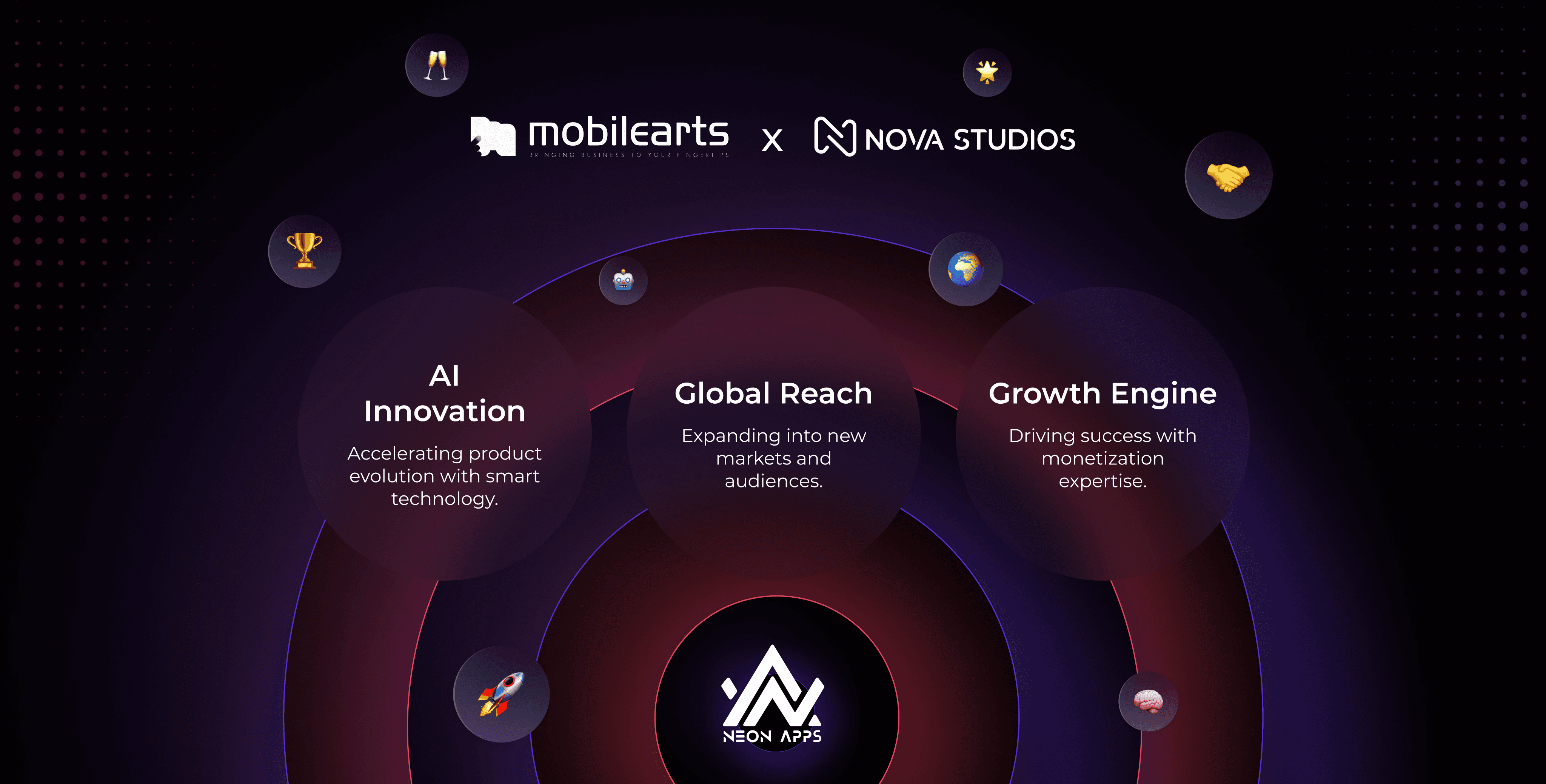 Neon Apps is excited to announce that Nova Studios, one of the innovation units originally founded within our organization, has been acquired by Mobile Arts, a global leader in mobile content, fintech solutions, and digital monetization. This strategic acquisition marks a significant milestone for both companies and highlights the strength and vision of Neon Apps’ product development. It is a testament to the innovation fostered within Neon Apps and demonstrates the impact of our approach to building scalable, AI-powered mobile apps.