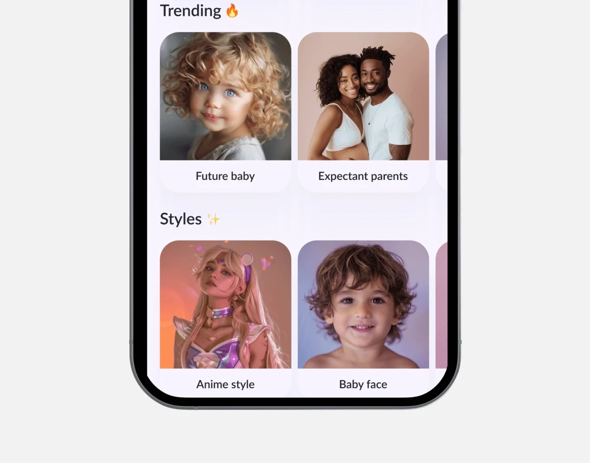 Users upload two photos and choose a style or look for the preview. The app generates a realistic or playful baby image in seconds. A simple layout allows retrying different combinations quickly. One-tap save and share makes it easy to send results to family, friends, or social apps.